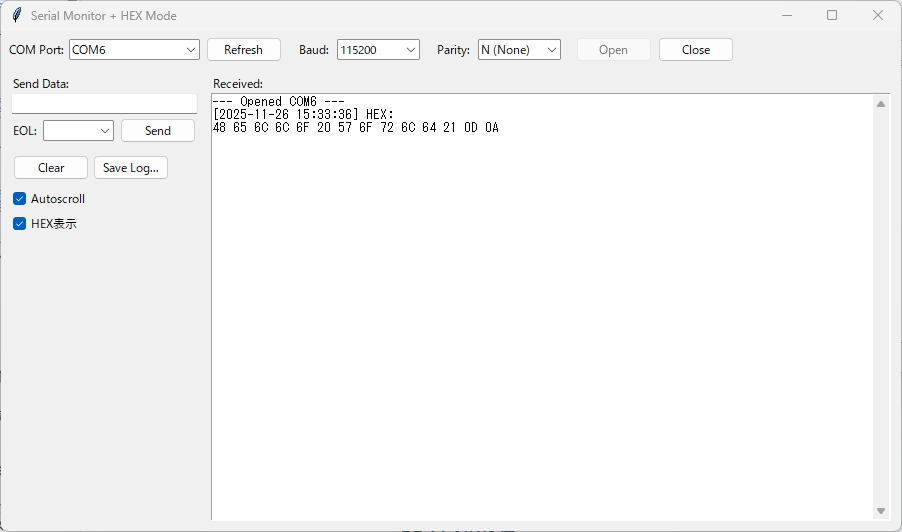このアプリを使えば、文字列だけでなく、バイナリデータも16進数で見やすく表示できるため、組み込み開発やデバッグに非常に役立ちます。